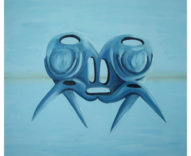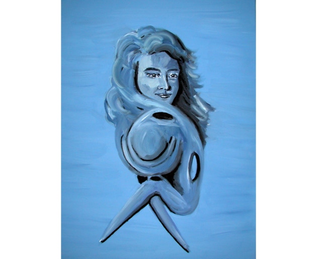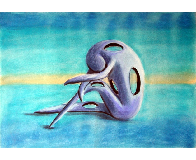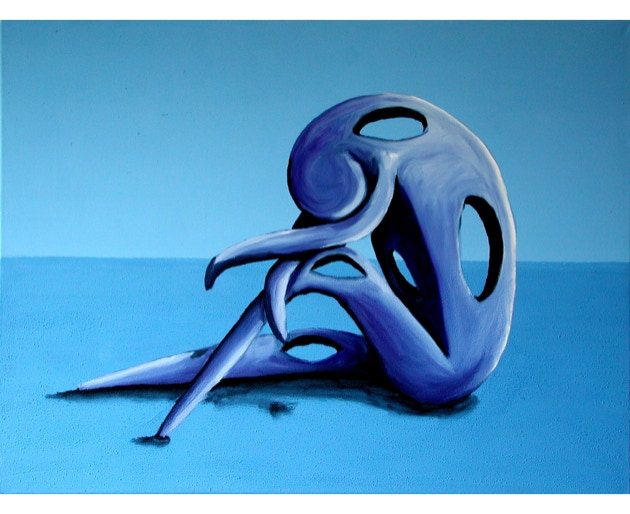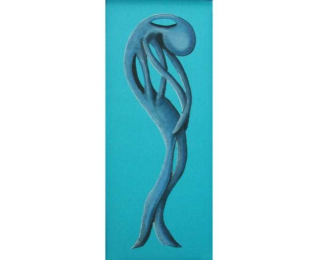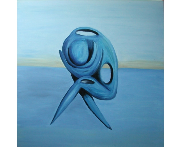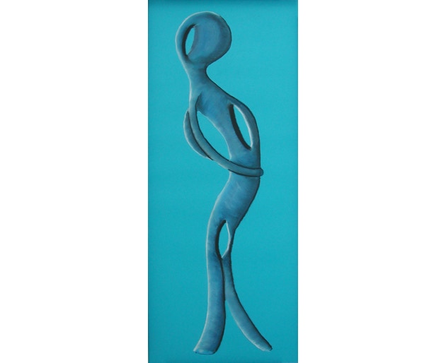 Figures with holes on a blue background drawn in blue with a blue horizon: stylized, abstract persons, open-worked.