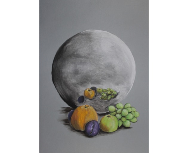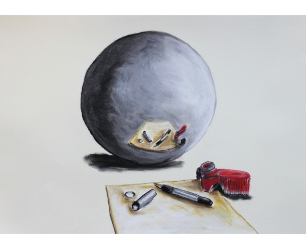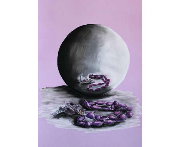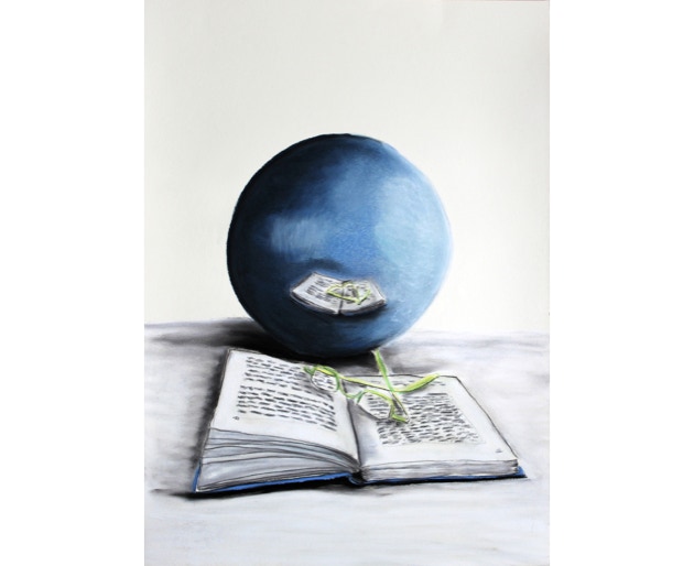 Profane things in front of a sphere or in a sphere. A spherical mirror distorts reality, generates pictures coming from its center, distorts perspectives. Apparently parallel lines become curved. Objects facing a spherical mirror uncover their conflicting being. What do we see: a spherical world, a mirror world, a crystal ball?