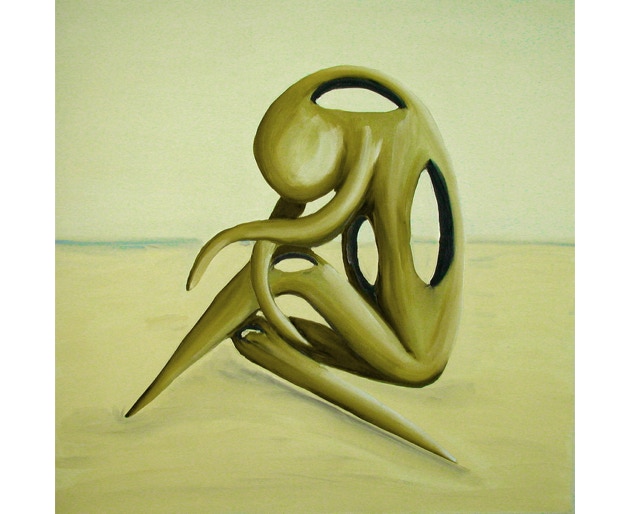 Figures with holes on a blue background drawn in blue with a blue horizon: stylized, abstract persons, open-worked.
